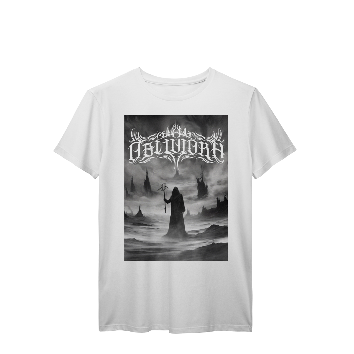 Malha Prime (100% algodão, fio 26.1). Com uma gramatura mais pesada (180 g/m²) e toque aveludado, essa peça tem a estrutura necessária para ancorar uma estampa densa e cheia de contrastes sem deformar ou pesar no peito.